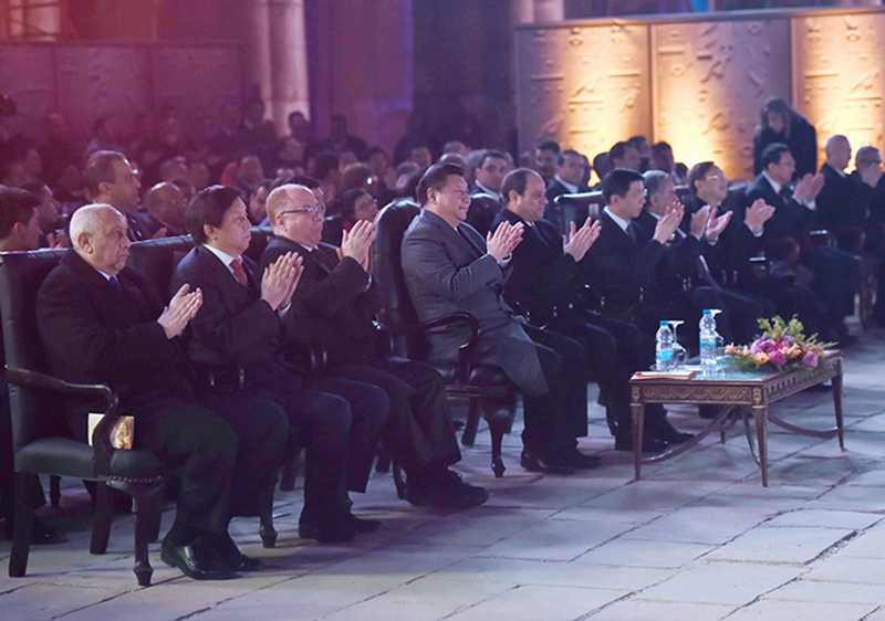 2016年1月21日,国家主席习近平和埃及总统塞西在古老的卢克索神庙广场共同出席中埃建交60周年庆祝活动暨2016中埃文化年开幕式。新华社记者 张铎 摄