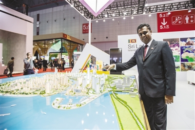 2018年11月6日,在上海举行的首届中国国际进口博览会上,斯里兰卡馆的工作人员通过沙盘模型向观众介绍正在建设的科伦坡港口城,该项目是中斯两国在“一带一路”建设中的重点合作项目。