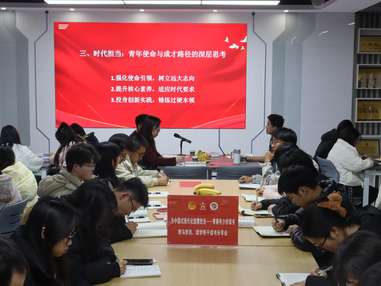 活动伊始,青马学员代表宣读了读书倡议书。马克思主义学院副院长邱云慧领学了党的二十届四中全会公报,鼓励同学们将阅读融入日常,做到学思结合、知行合一。马克思主义学院青年教师马鹏博士结合《习近平谈治国理政》第五卷与党的二十届四中全会精神的学习,分享了个人求学与工作的实践感悟。在读书分享环节,青马学员们围绕“学习宣传贯彻党的二十届四中全会精神”“坚定文化自信”“强化科技创新”等主题分享读书心得,交流学习经验。校团委副书记王志斌充分肯定了活动成效,表示校团委将持续创新活动形式,丰富活动内容,助力学校“大思政课”建设,引导广大青年在中国式现代化建设中挺膺担当。