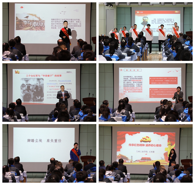 活动中,我校“青春引路人”理论宣讲团成员,经济管理学院电商18-2班张植清同学,经济管理学院物流19-2班 赵文洁同学,电气工程学院党委书记王重贤老师,电气工程学院辅导员张芙颖老师,电子信息工程学院电信18-1班吴成龙同学,土木工程学院辅导员王冰澈老师,以历史脉络为主线,分别以《五四运动时代锋芒,当代青年于国无疆》《开天辟地,红船起航》《长征,红旗漫卷西风》《重庆谈判》《脚踏尘埃,肩负重任》《传承红色精神,涵养初心使命》为题,为在场的全体师生讲述了一堂生动的思想政治教育课。