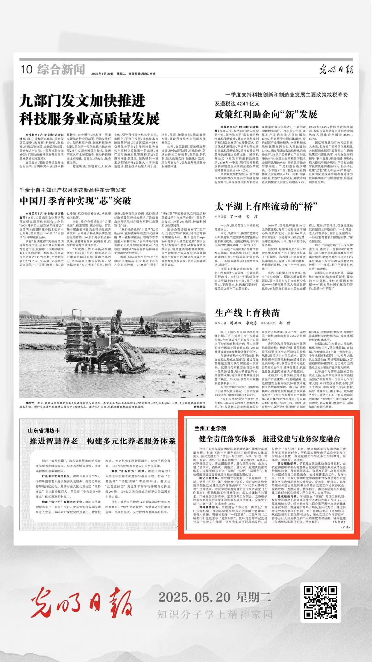 近年来,兰州工业学院持续深入学习习近平总书记关于党的建设重要论述,把旗帜鲜明讲政治要求贯穿到党建工作与事业发展全过程,全力构建“清单式、链条式、倒逼式、量化式”党建责任落实体系,实现党建与业务“双融”“双促”“双提升”,有效促进党建优势转化为学校高质量发展优势。2025年5月20日,《光明日报》以《健全责任落实体系 推进党建与业务深度融合》为题,对我校党建工作经验做法作了专题报道。