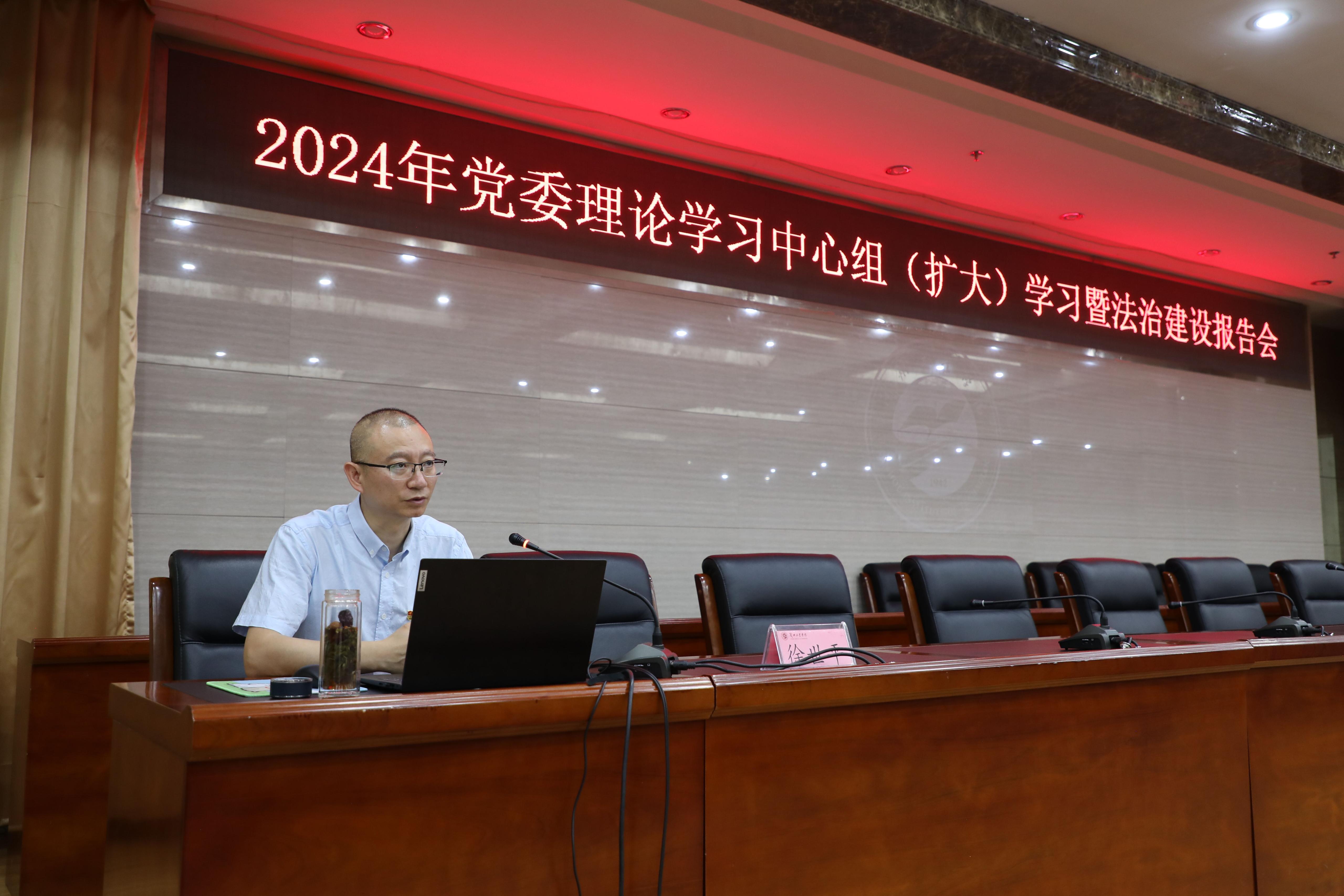 6月18日下午,学校在第三学术报告厅举行2024年党委理论学习中心组(扩大)学习暨法治建设报告会,甘肃省委党校(甘肃行政学院)政治和法律教研部副主任徐世平教授应邀作专题报告。党委书记韦尧兵,党委副书记、校长刘新辉及其他在家校领导出席报告会。党委副书记黄荟铭主持报告会。