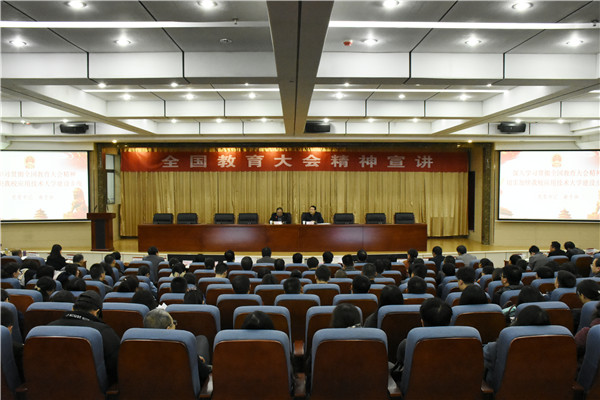 会上,俞子泓以《深入学习贯彻全国教育大会精神,切实加快我校应用技术大学建设步伐》为题,从“充分认识全国教育大会的重大意义”,“深入学习领会习近平总书记关于教育的重要论述”,“确保教育大会精神落实落地”,“以习近平总书记重要讲话和全国教育大会精神为根本遵循、奋力开创学校转型发展新局面”四个方面深入浅出,全面准确系统深入地宣讲了全国教育大会精神。