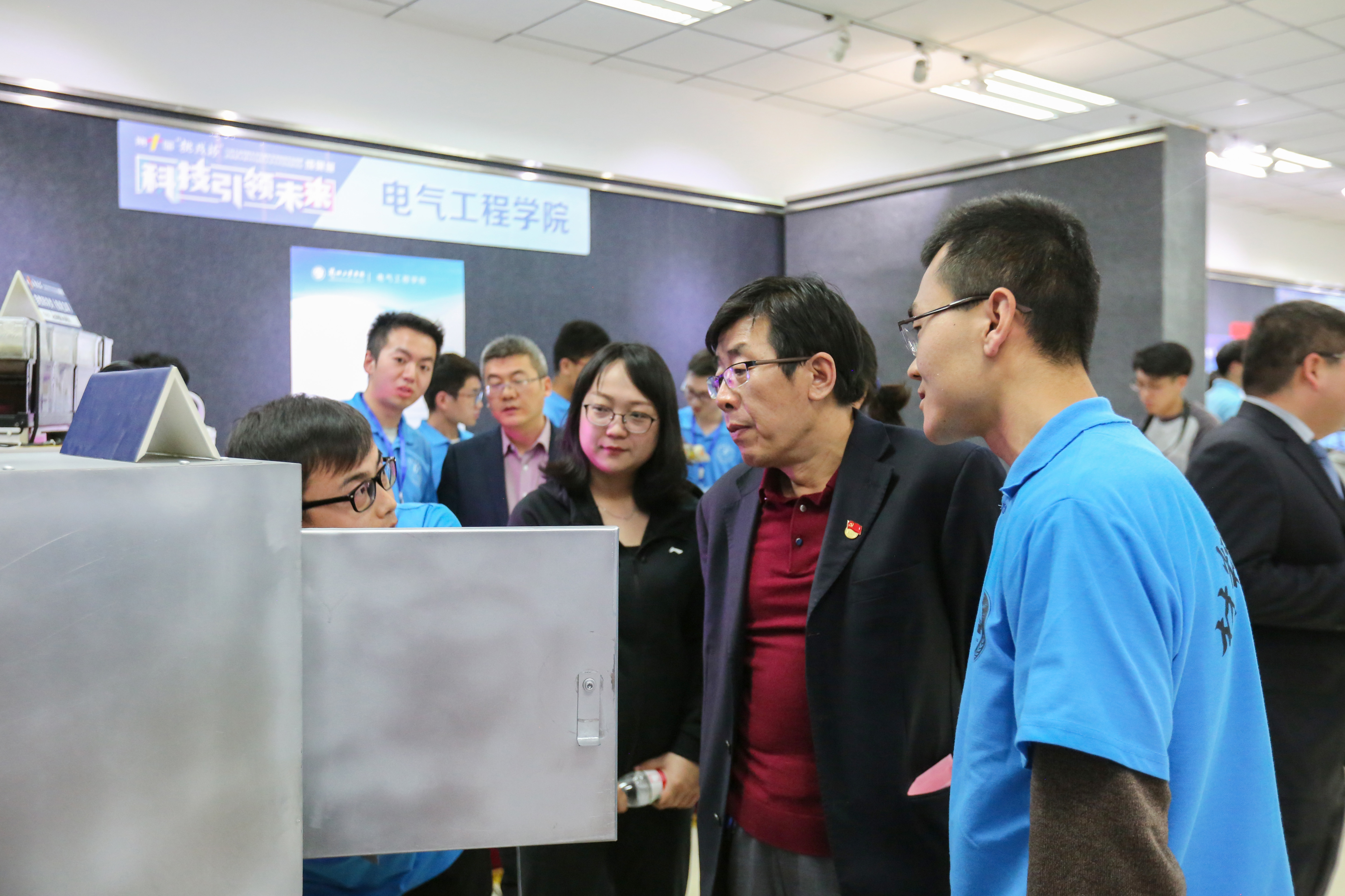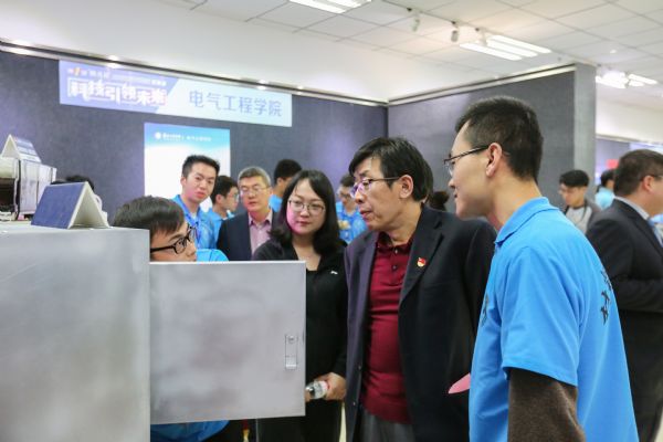开幕式后,马江一行观看了学生科技作品,并与参赛师生亲切交流,详细了解作品的功能、设计理念、发展方向和应用前景等。400余名参赛学生和参赛团队通过模拟视频演示、模型演示向参观的师生讲解作品原理。