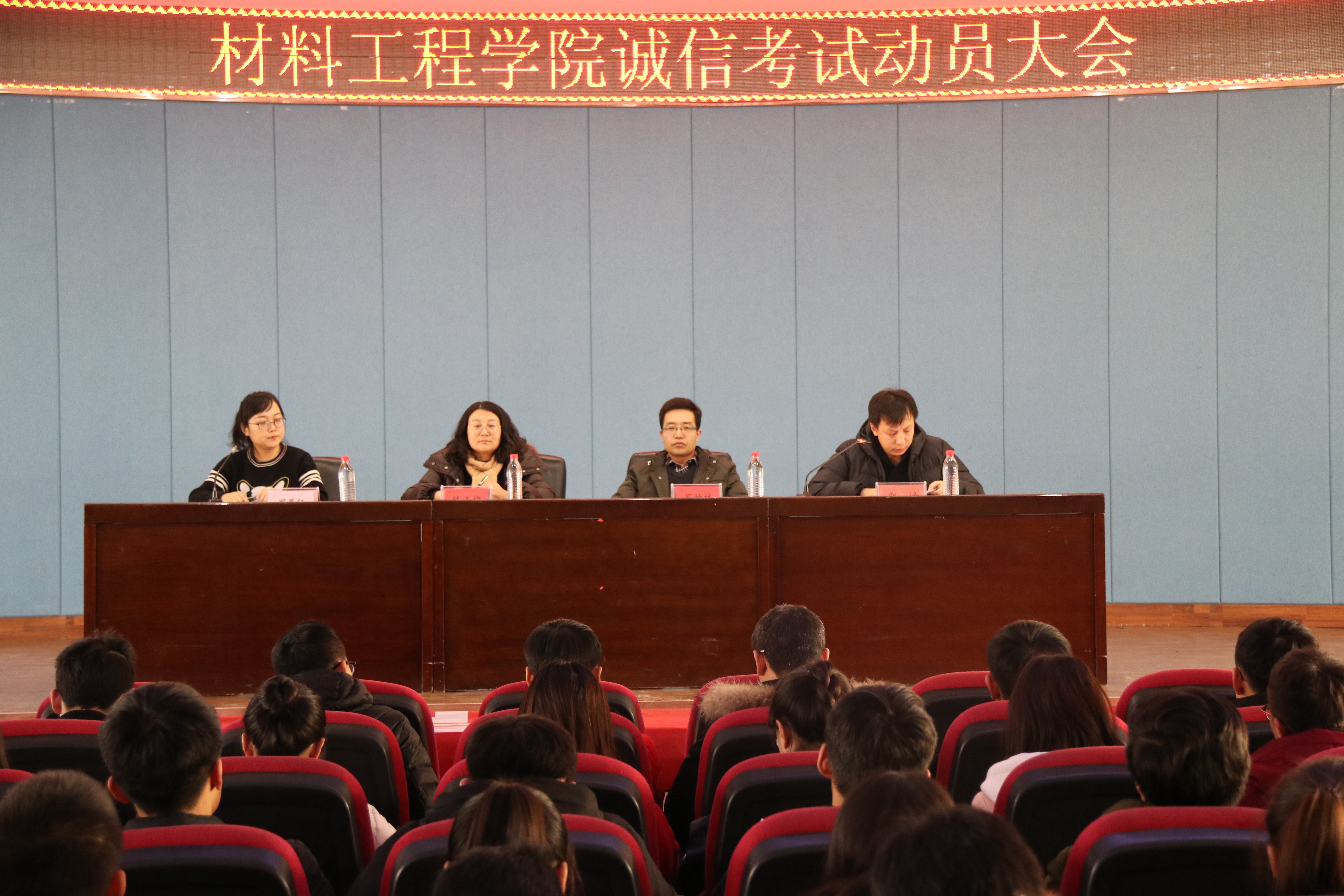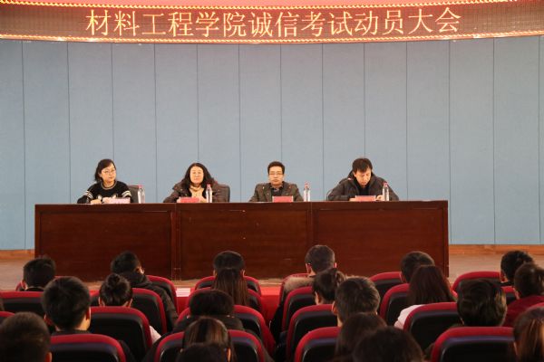 1月4日下午,材料工程学院在八楼会议中心召开加强考风考纪动员大会,学院党委书记罗柏林,党委副书记、副院长陈玉梅,部分辅导员、班主任以及2018级全体学生参加了会议。
