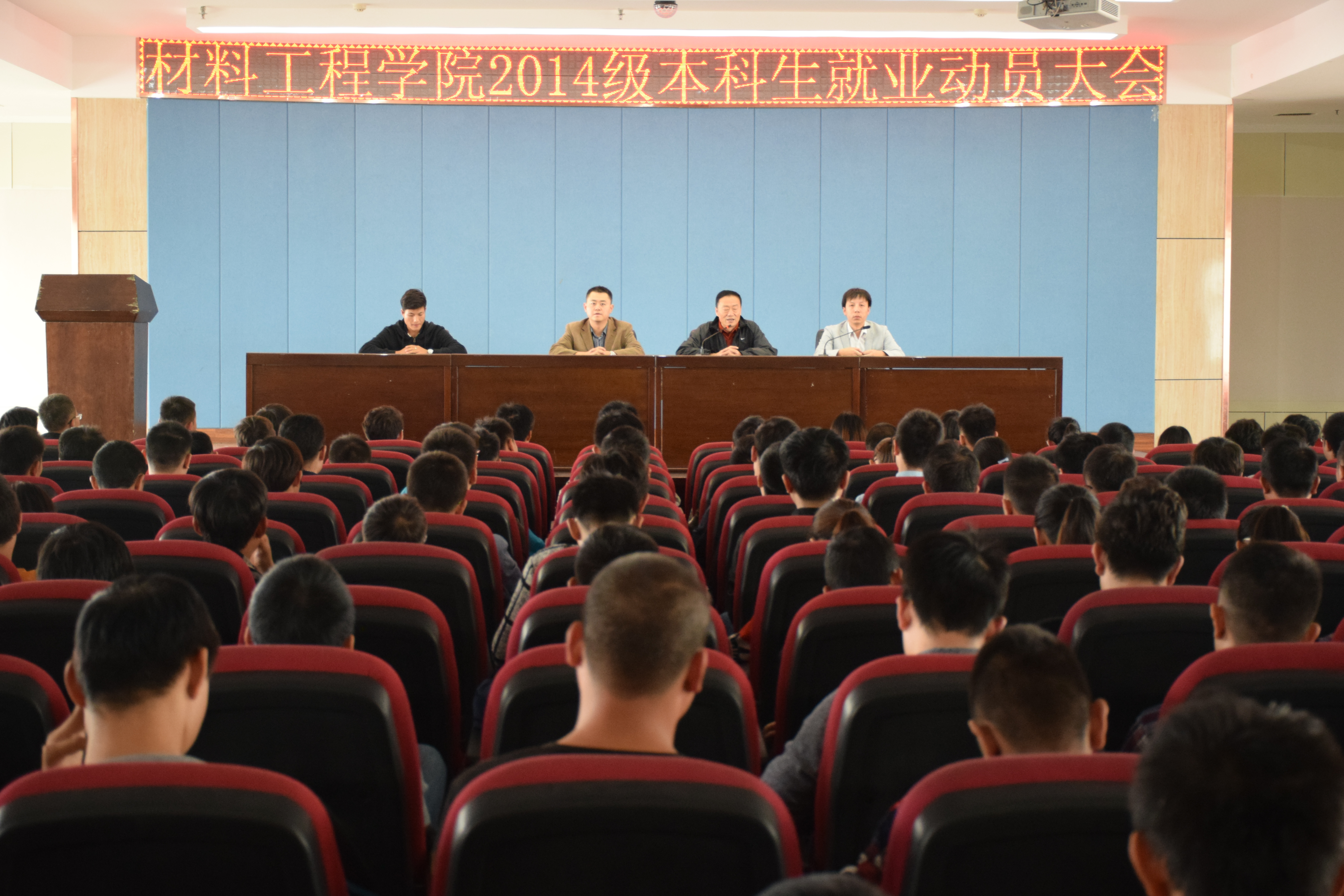 8月29日下午,材料工程学院在八楼会议中心召开2014级本科生就业动员大会。学院党总支书记韩国才、副院长贾魁、学工办主任郭峰、学院优秀毕业生代表路龙龙以及2014级本科生参加了大会。