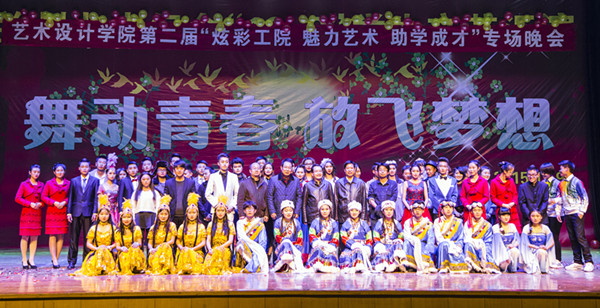 12月11日晚,艺术设计学院“炫彩工院,魅力艺术,助学成长”专场晚会在学校礼堂成功举办。纪委书记廉志端,副校长马铁信、李贵山,学生处,学院党总支书记、团支部书记以及艺术设计学院全体教师观看了晚会。 在热情奔放的音乐声中,晚会拉开了序幕,12个不同色彩不同风格的节目精彩上演,或浪漫温馨,或轻快悠扬,或活泼动感,风格各异变幻多姿,令观众心旷神怡,沉醉其中。晚会最后在《难忘今宵》的歌声中圆满结束。 晚会结束后,廉志端、马铁信、李贵山与全体演职人员合影留念。(供稿、摄影/艺术设计学院)